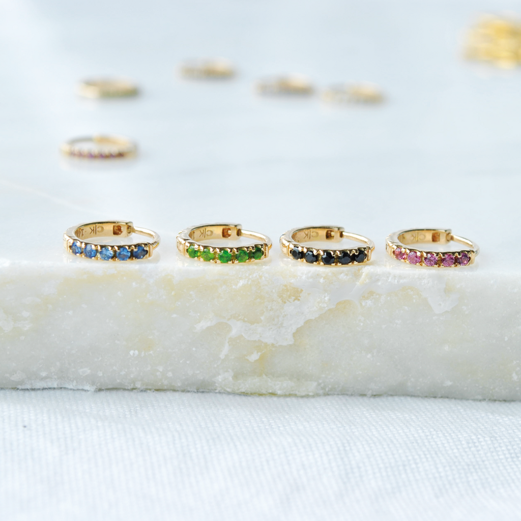 Prachtige hoops gemaakt van 14k massief goud en edelstenen. De hoops zijn 1,5 mm dik en hebben een diameter van 8 mm. Deze beauties zijn verkrijgbaar in diamant, blauwe saffier, roze rhodoliet, zwarte spinel en groene di-chroom.