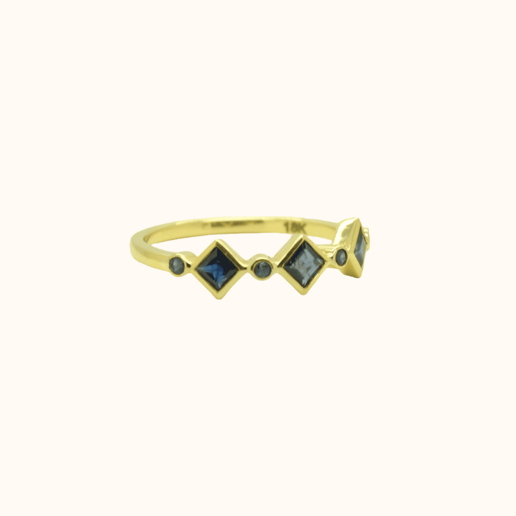 Deze tijdloze 18K geelgouden ring is voorzien van vierkante saffieren en vijf briljant geslepen saffieren, perfect om te dragen met andere ringen. Een must-have voor elke sieraden lief hebber!