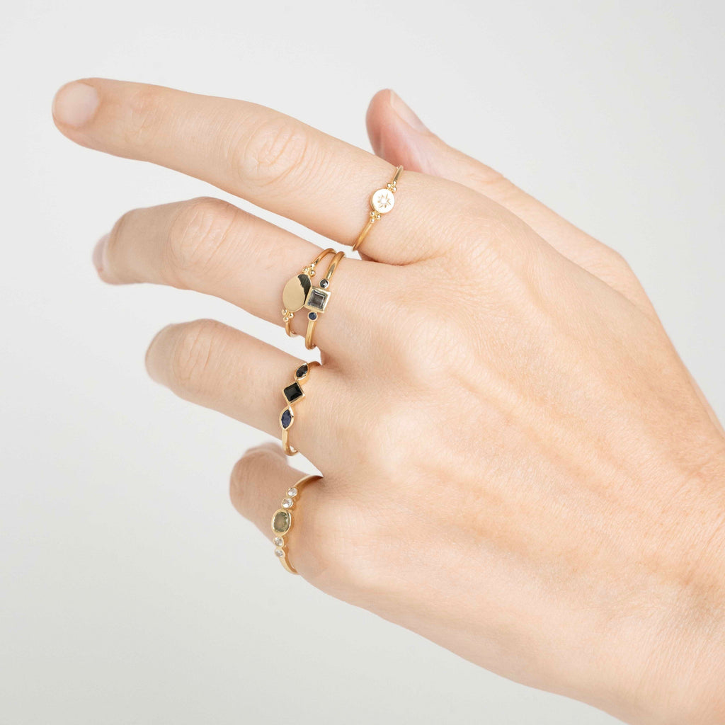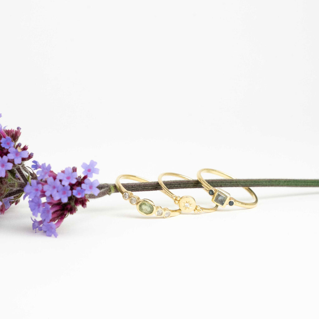 Deze tijdloze 18K geelgouden ring heeft een vierkante saffier en twee briljant geslepen saffieren, perfect om te dragen met andere ringen. Een must-have voor elke sieradenliefhebber!